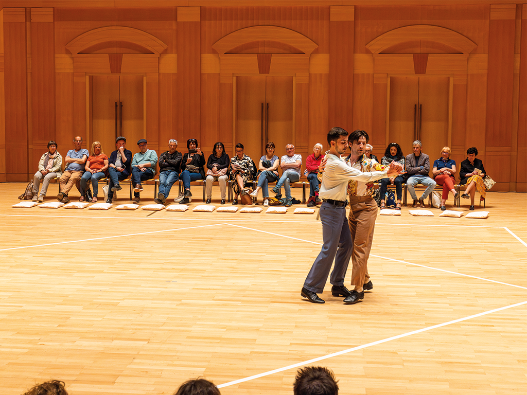 Alessandro Sciarroni travaille avec les danseurs Gianmaria Borzillo et Giovanfrancesco Giannini sur les pas d’une danse bolonaise appelée Polka Chinata. Il s’agit d’une danse de cour exécutée à l’origine uniquement par des hommes et remontant au début des années 1900 : physiquement exigeante, presque acrobatique, elle nécessite que les danseurs s’enlacent, tournoient en se pliant à genoux presque jusqu’au sol.