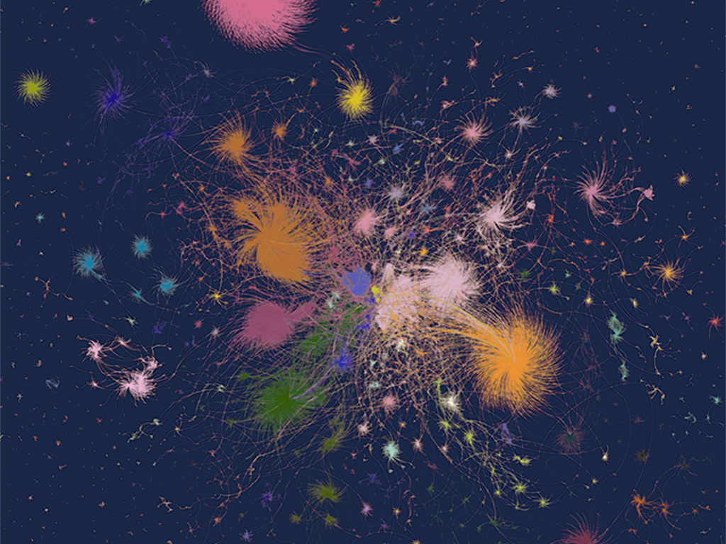 Olivier Bodini, enseignant, chercheur, directeur de l’école doctorale Galilée et artiste, présente ici une série de toiles construites autour de la visualisation d’organisations sociales. Les réseaux sociaux connectent des millions d’individus à travers le monde et structurent des groupes complexes qui s’entremêlent. Ces oeuvres, générées par un algorithme développé par l’artiste, sont des instantanés artistiques, abstraits et poétiques, de ces essaims tentaculaires.